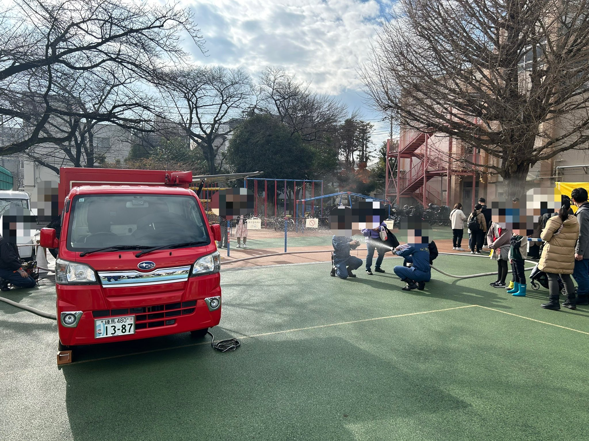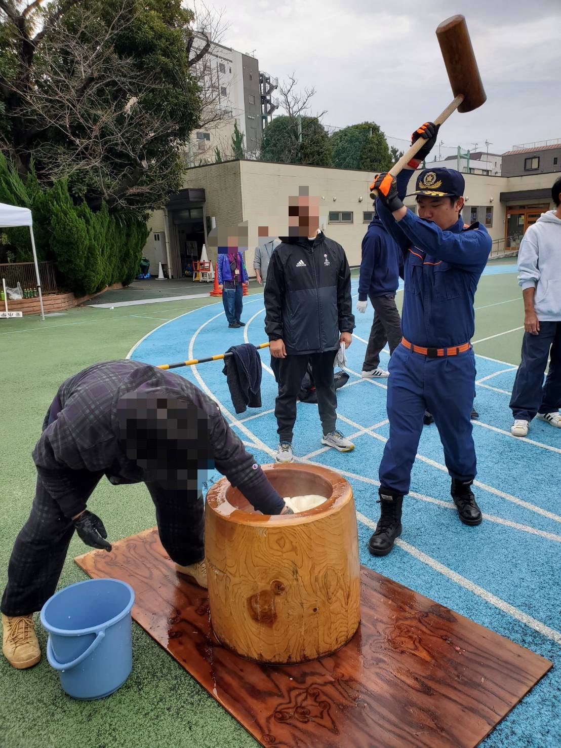 放水訓練コーナーの運営補助を行い、その後餅つきも手伝わせていただきました。